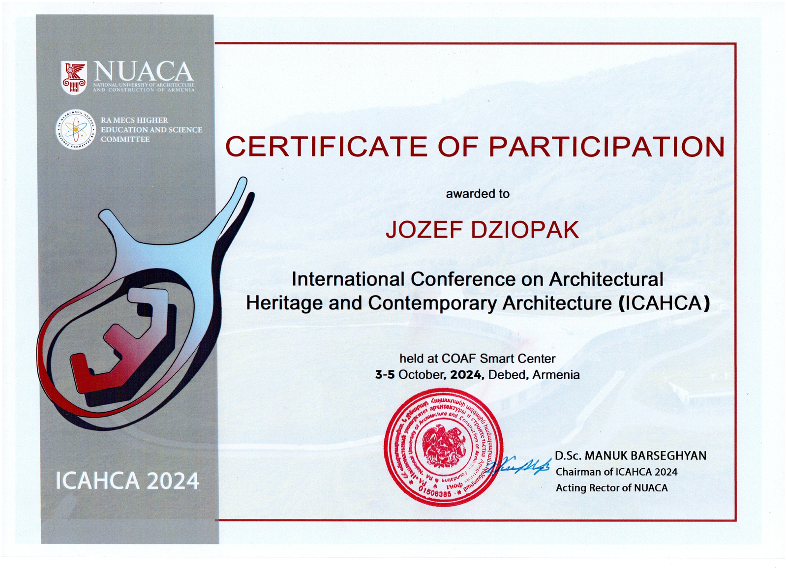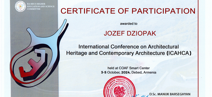 Profesor Józef Dziopak na zaproszenie Rektora NUACA uczestniczył w II międzynarodowej konferencji naukowej na temat Architectural Heritage and Contemporary Architecture, organizowanej przez National University of Architecture and Construction of Armenia i Komitet Szkolnictwa Wyższego i Nauki Republiki Armenii. Wraz z zespołem z AGH w Krakowie przedstawili referat dotyczący adaptacji miasta Krakowa do zmian klimatycznych pt. „Evolution of cities under climate change: greening and blue-green infrastructure”, który jest planowany do publikacji w czasopiśmie technicznym w 2024 roku.